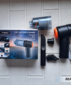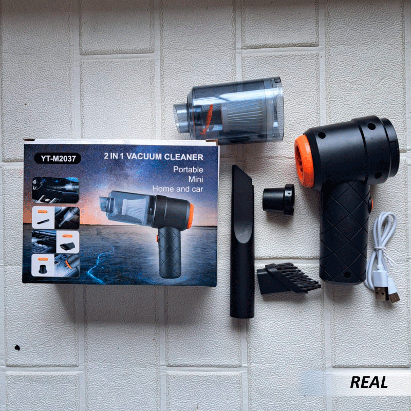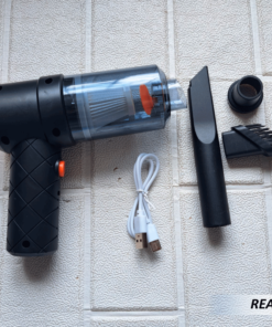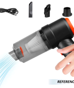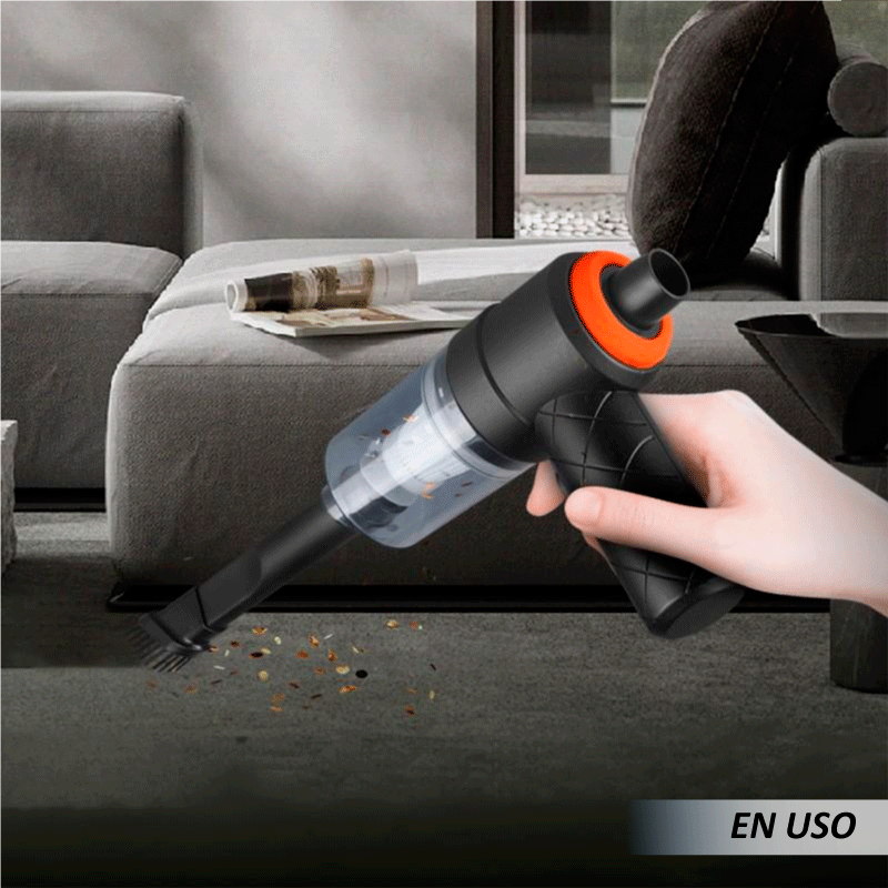 ¿Qué es?: Mini aspiradora compacta, fácil de usar por un tiempo prolongado. Cuenta con 3 funciones: aspiración, limpieza (con accesorios de cepillo) y soplador (parte posterior).