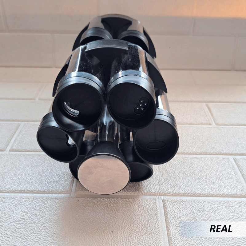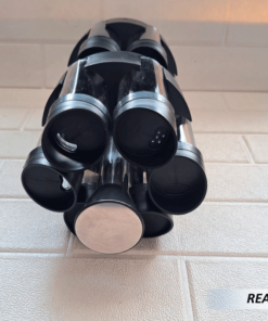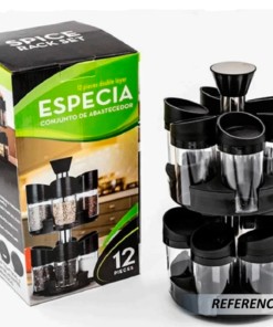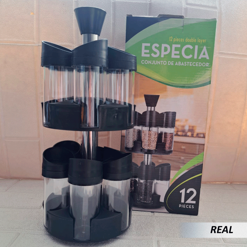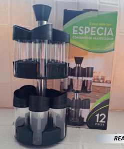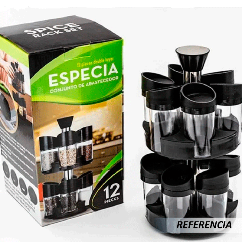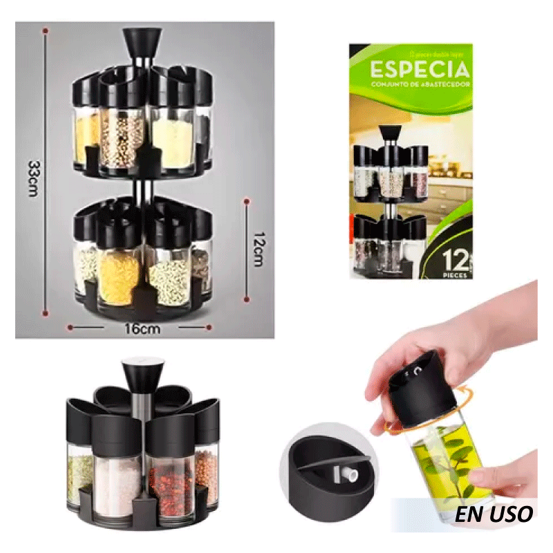 ¿Qué es?: Set de 12 especieros con base giratoria en 360 grados y múltiples salidas para graduar la salida de sus condimentos, ideal para la cocina.